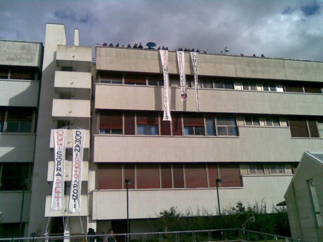In quasi un centinaio si sono recati ed hanno preso possesso dell’ultimo piano dell’edificio, dove è situato l’ufficio del Magnifico Rettore prof. RaimondoPasquino, per poi salire sul tetto da cui hanno calato degli striscioni lungo tutta la facciata del palazzo.